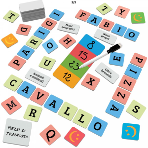 Contenuto: 69 tessere-lettera; 10 cartine-categoria; 4 tessere jolly; 1 lavagnetta; scheda segnapunti; 1 pennarello cancellabile; Regolamento