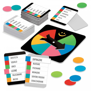 Contenuto: 15 carte-soggetto; 15 carte-azione; 1 spinner; 18 gettoni punteggio; Regolamento