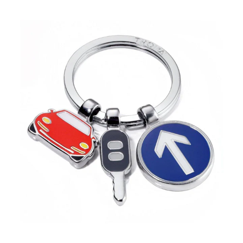 Con le sue dimensioni compatte di 62x60x7mm, il portachiavi Troika si adatta perfettamente a ogni tasca o borsa, offrendo al contempo un tocco di stile inconfondibile. I tre pendenti iconici - un'auto rossa stilizzata, una chiave e un segnale stradale blu - catturano l'essenza del viaggio e dell'esplorazione, rendendolo l'accessorio ideale per gli amanti delle automobili e degli spostamenti.