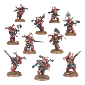 Con questo kit multicomponente di plastica puoi assemblare 10 Berzerker di Khorne, sovrumani arieti viventi a cui sono stati impiantati i Chiodi del Macellaio, marchingegni che li spingono alla furia.